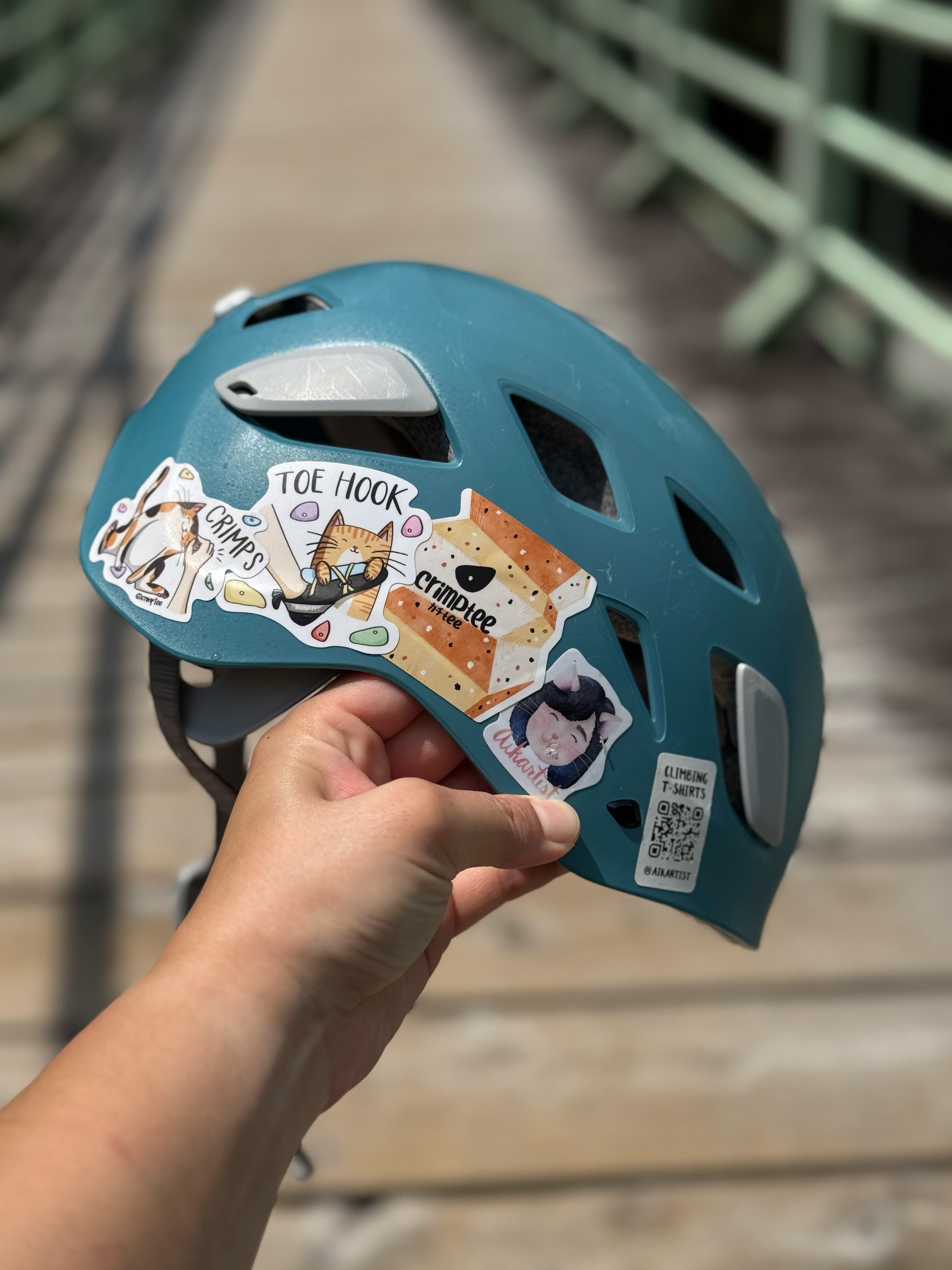 This illustration was inspired by those playful moments when cats cling to your feet, this happy little climber brings a fun twist to your gear. Perfect for your chalk bottle, water bottle, laptop, or any flat surfaces!